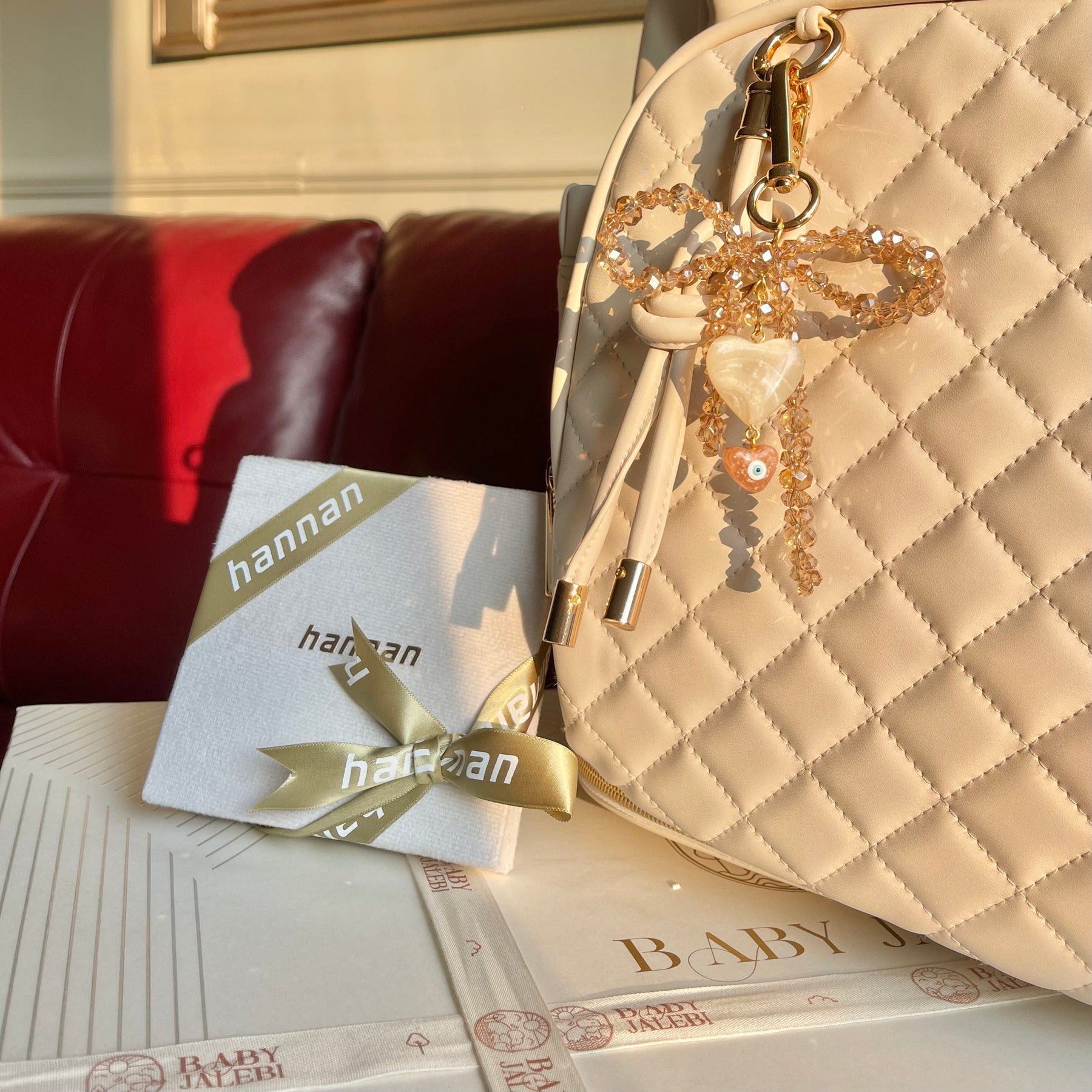 Three part bag charm with a beaded brown crystal bow, a galaxy cream HANNAN heart and a peach mini HANNAN heart charm with evil eye enamelling.