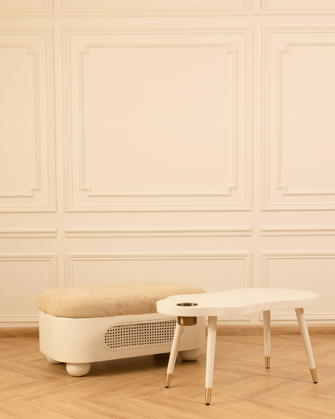 With this extension kit, the bassinet body becomes the base of a storage bench, finished with a plush upholstered topper in our signature fabric. The kit includes four rounded ball legs that elevate the bench, creating a sculptural yet practical addition to your home.