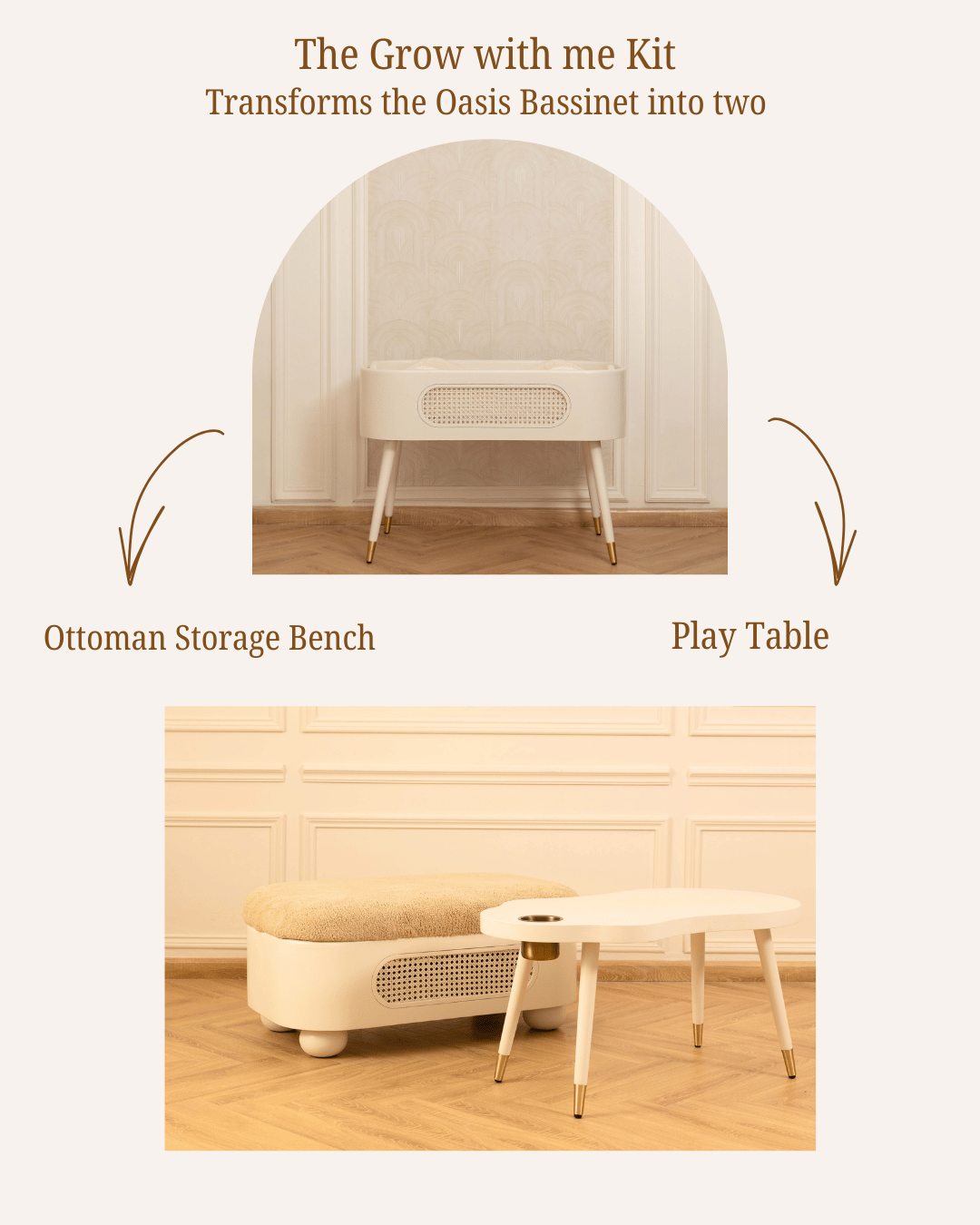 Designed to evolve beautifully with your child, the Grow With Me Kit transforms your Oasis Bassinet into a functional, design-forward furniture piece for the years ahead.